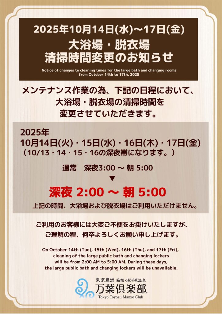 上記の時間、大浴場および脱衣場はご利用いただけません。