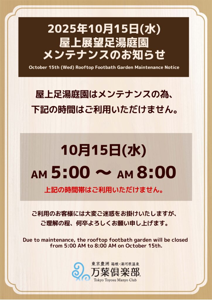 また、屋上足湯庭園もメンテナンスの為、 下記の日時はご利用いただけません。