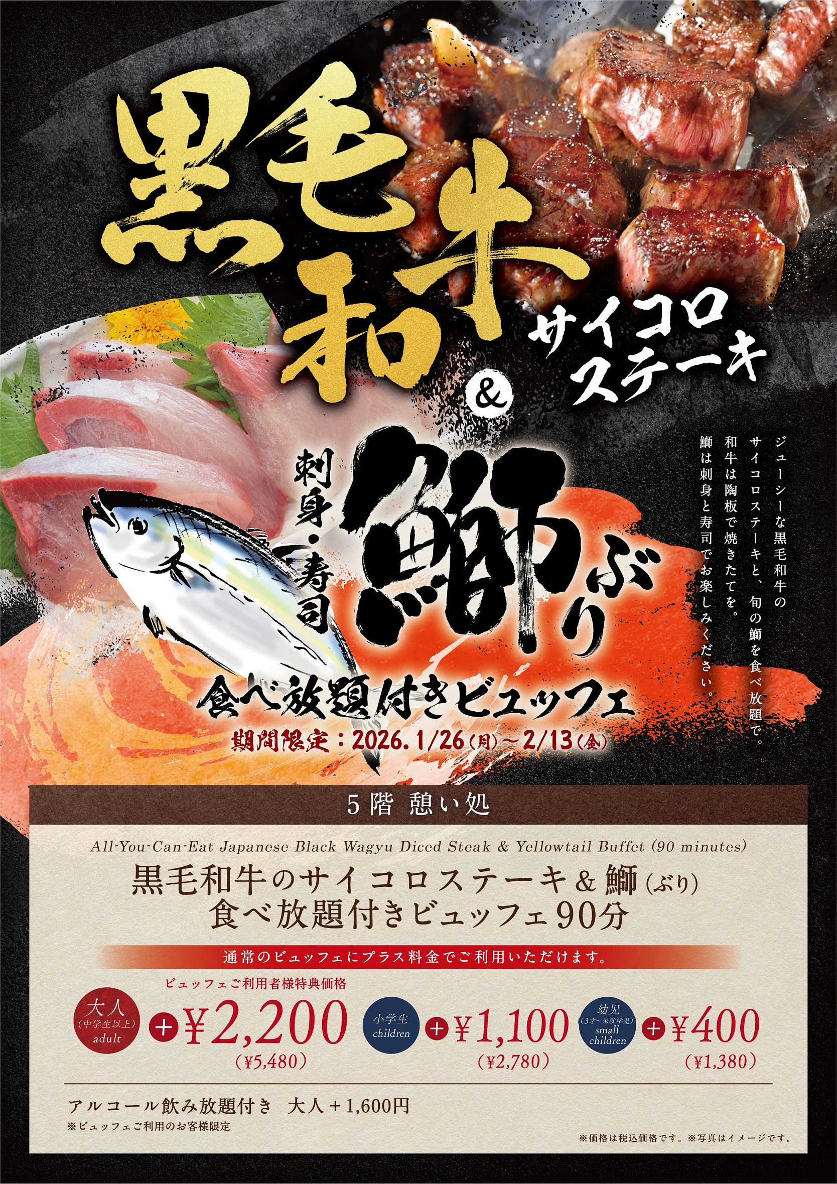黒毛和牛サイコロステーキ&鰤 食べ放題付きビュッフェ開催!!!