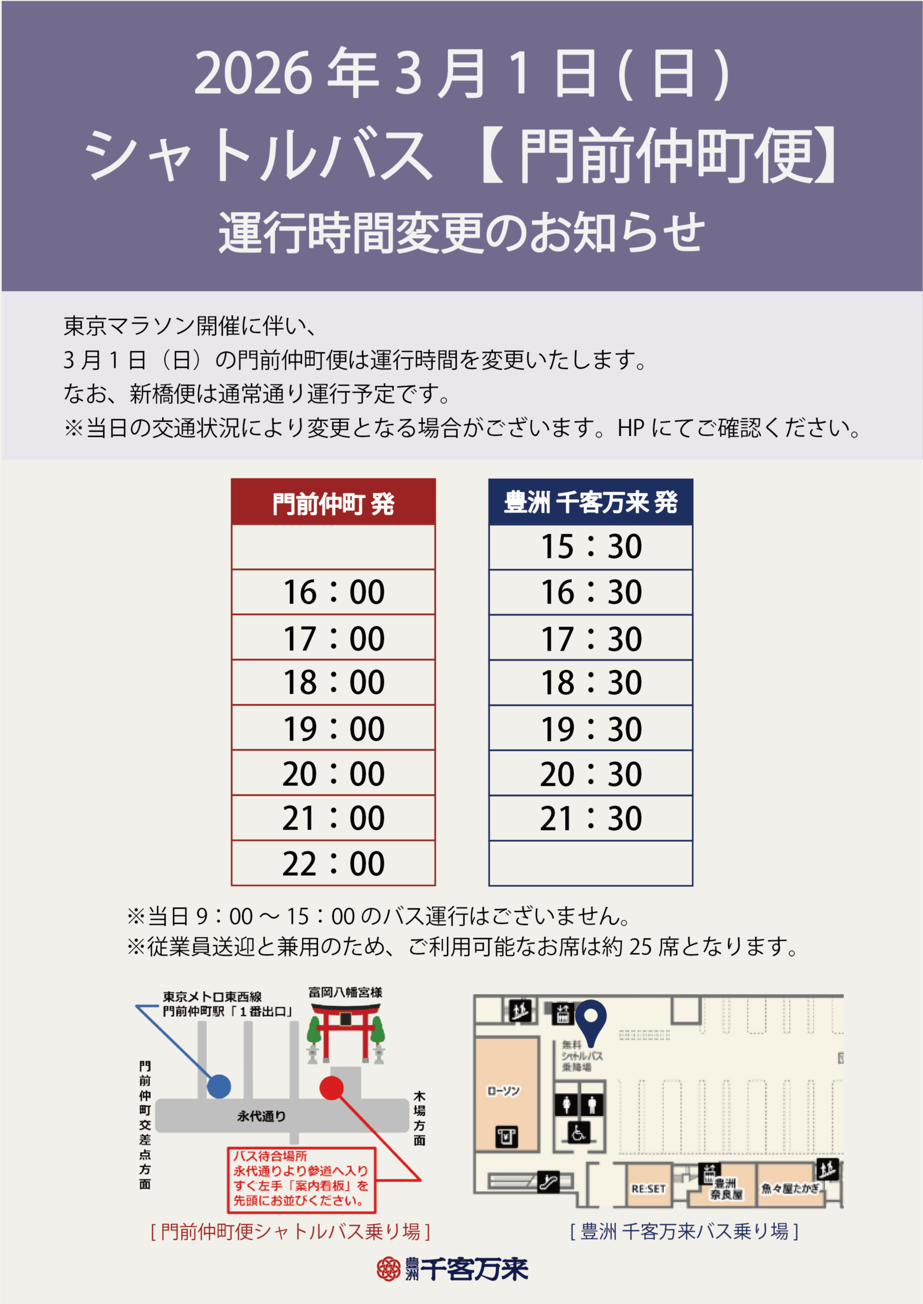 東京マラソン開催に伴い、 2026年3月1日(日)の門前仲町便は運行時間を変更いたします。